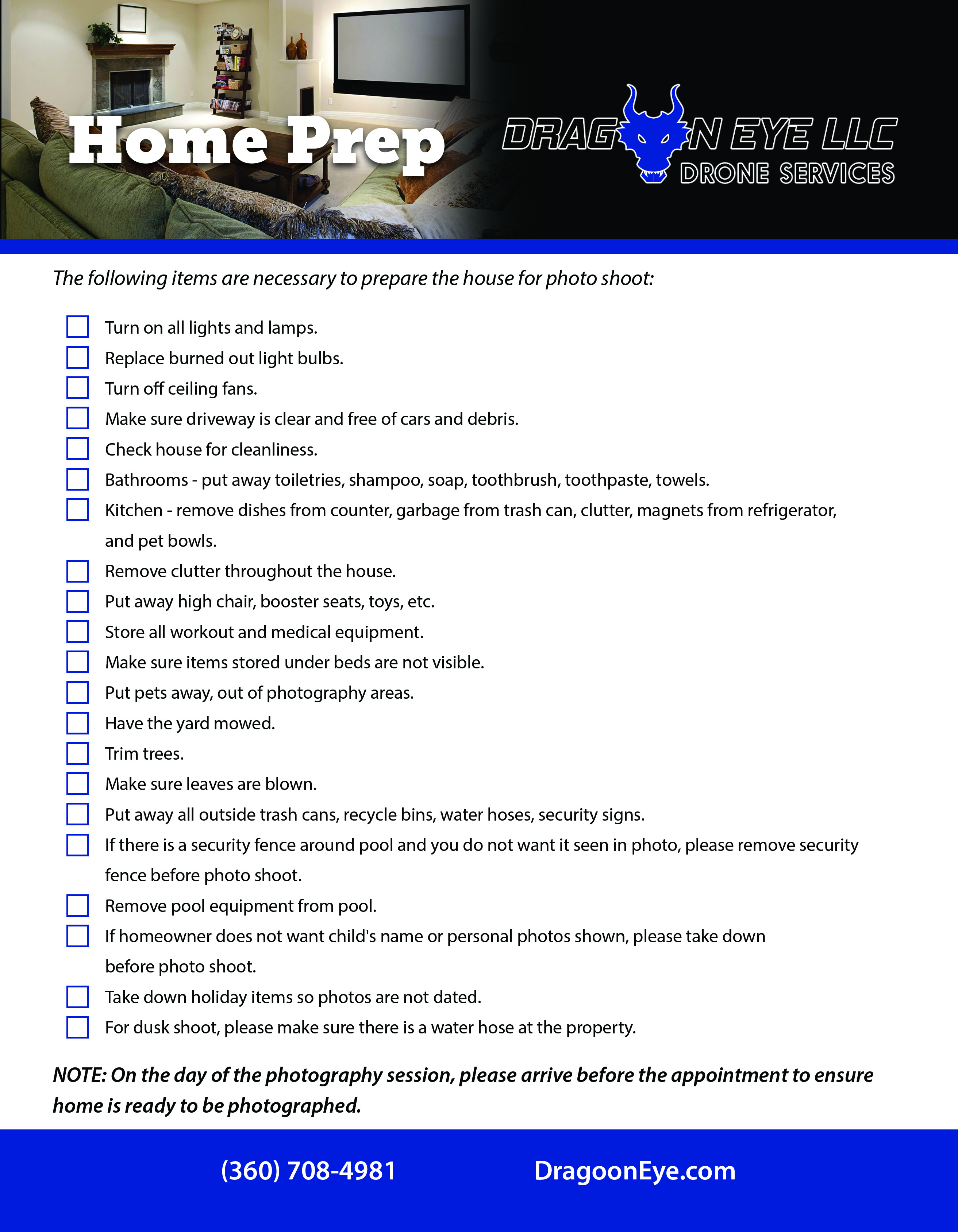 After setting an appointment with Dragoon Eye LLC, please review the home preparation flyer to ensure your property is ready for the photo shoot. Here you will see all those requirements for photography